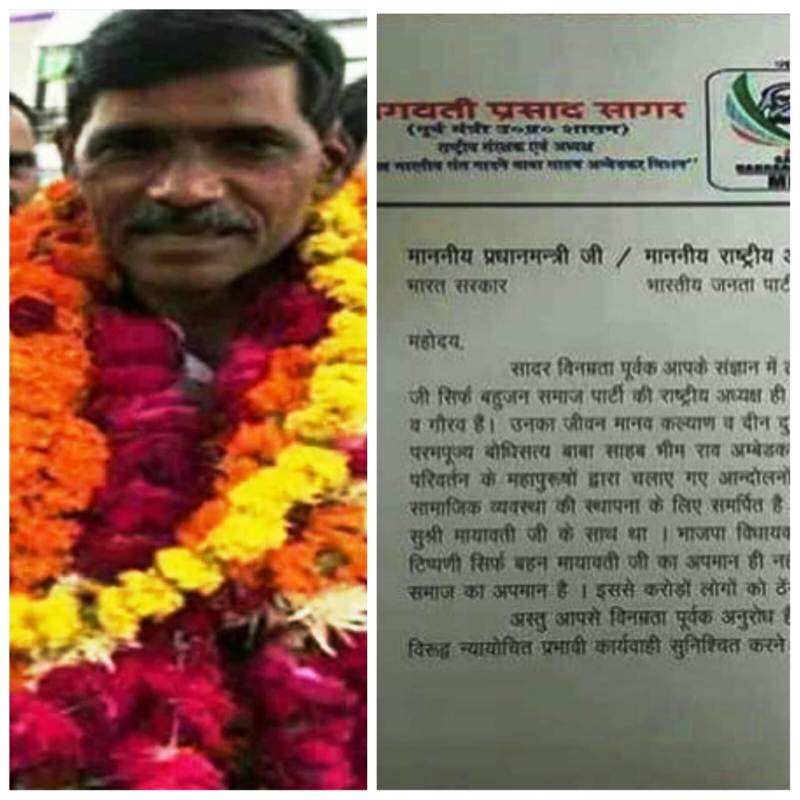 भाजपा विधायक भगवती प्रसाद सागर ने मीडिया से बातचीत के दौरान कहा कि उन्होंने देश के पीएम नरेंद्र मोदी, भाजपा राष्ट्रीय अध्यक्ष अमित शाह और सीएम योगी आदित्यनाथ को पत्र लिख कर विधायिक साधना सिंह के खिला अनुशासनात्मक कार्रवाई की मांग की है। कर दी है। विधायक ने बताया कि वह अखिल भारतीय संत बाबा साहब आंबेडकर मिशन के राष्ट्रीय संरक्षक एवं अध्यक्ष हैं। उनके द्वारा जो पत्र लिखा गया है, वह इसी संस्था के लेटर पैड पर है। वह विधायक से पहले एक दलित हैं। पूर्व सीएम और बसपा सुप्रीमो ने दलितों के हित में कई वर्षों तक उन्होंने संघर्ष किया। उन्होंने सीएम, पीएम और भाजपा राष्ट्रीय अध्यक्ष को एक दलित और दलित संगठन का पदेन अध्यक्ष होने के नाते लिखा है। कहा, सियासत में राजनेता एक-दूसरे पर आरोप-प्रत्यारोप तो लगा सकते हैं पर किसी पर अर्मादित भाषा बोलने की किसी को छूट नहीं चाहिए।