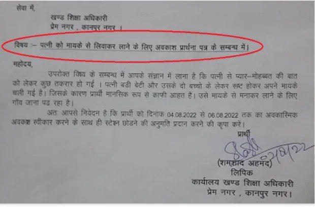 कानपुर के शमशाद अहमद ने 4 अगस्त से 6 अगस्त तक अवकाश पर रहने के लिए खंड शिक्षा अधिकारी प्रेम नगर को आवेदन लिखा है। अपने आवेदन में शमशाद ने पत्नी और उनके बीच हुई प्यार की तकरार को बताया है। उन्होंने अवकाश की वजह बताई है कि उनका पत्नी से किसी बात को लेकर तकरार हो गई। पत्नी बड़ी बेटी और दो बच्चों संग रूठकर मायके चली गई है। पत्नी और बच्चों के जाने की वजह से वह मानसिक रूप से बहुत परेशान और दुखी है। पत्नी को मनाकर वापस लाने के लिए गांव जाना पड़ रहा है। वहीं, आवेदन वायरल होने के बाद शमशाद के साथी हंसी मजाक भी कर रही हैं।