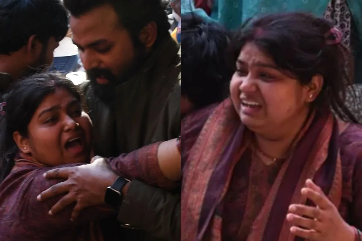 पोस्टमार्टम हाउस में माता पिता व भाई के शव देखकर रोती बिलखतीं मृतक चेतराम की बेटी प्रीति।