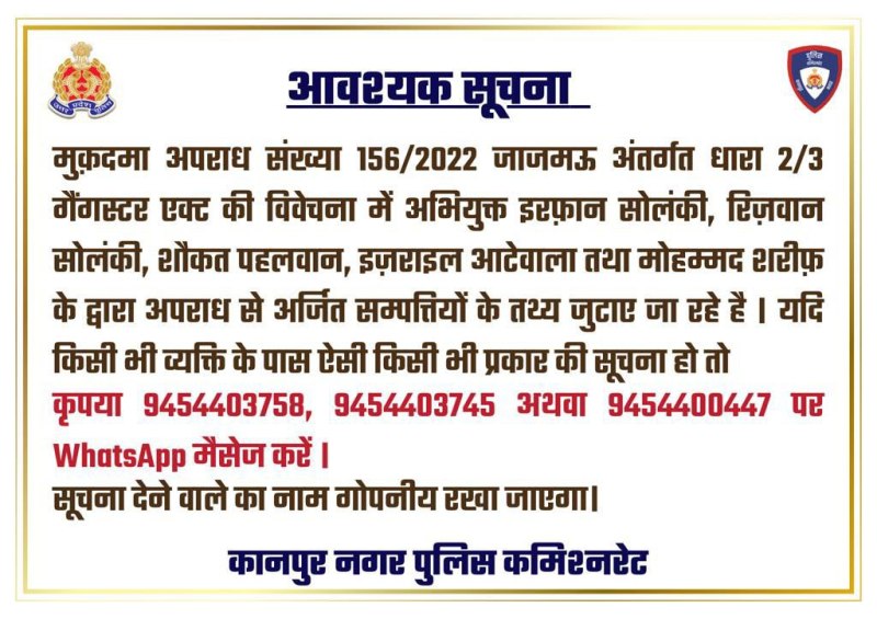 कानपुर नगर पुलिस कमिश्नरेट की तरफ से जारी सूचना में बताया गया है कि गैंगस्टर एक्ट की विवेचना में अभियुक्त इरफान सोलंकी, रिजवान सोलंकी, शौकत पहलवान, इजराइल आटे वाला और मोहम्मद शरीफ के अपराध से अर्जित की गई संपत्तियों के आंकड़े जुटाए जा रहे हैं। यदि किसी व्यक्ति को इनके के विषय में कोई जानकारी है तो कानपुर पुलिस द्वारा जारी किए गए नंबर पर दे सकते हैं। सूचना देने वाले का नाम गुप्त या गोपनीय रखा जाएगा।