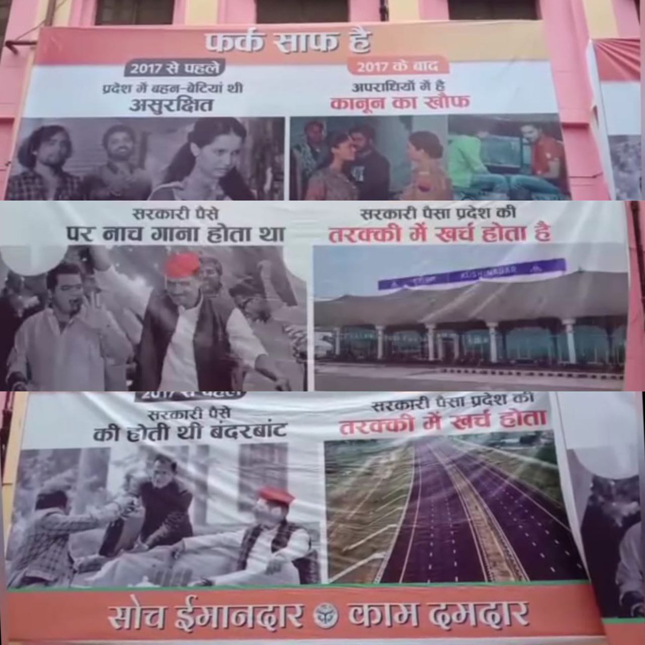 सोच इमानदार काम दमदार के अंतर्गत बीजेपी की तरफ से फर्क साफ है नाम से होर्डिंग्स लगाई जा रही है। कानपुर की उर्सला हॉस्पिटल में लगाई गई होर्डिंग में बताया गया है कि 2017 के पहले प्रदेश में बहन-बेटियां असुरक्षित थी, 2017 के बाद अपराधियों में कानून का खौफ। इसी प्रकार की एक अन्य होर्डिंग में लिखा है कि 2017 के पहले सरकारी पैसे नाच गाना होता था, 2017 के बाद सरकारी पैसा प्रदेश की तरक्की में खर्च हो रहा है। वहीं एक अन्य होर्डिंग में लिखा है 2017 के पहले सरकारी पैसे की होती थी बंदरबांट, 2017 के बाद सरकारी पैसा प्रदेश की तरक्की में खर्च होता है।