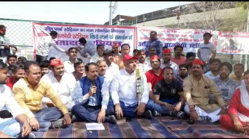 उन्होंने कहा कि देश की गरीब जनता महंगाई और बेरोजगारी से परेशान है या तानाशाही ही है जो जिंदा रहते स्टेडियम का नाम अपने नाम पर रख लिया हम जनता की परेशानियों पर कटाक्ष करने आए हैं और मांग करते हैं कि ग्रीन पार्क स्टेडियम का नाम क्षेत्रीय विधायक होने के नाते उनके नाम कर दिया जाए। इस मौके पर मोदी सरकार के खिलाफ जमकर नारेबाजी की। नारेबाजी में जनता के हित के काम करो, ना कर पाव तो स्टेडियम मेरे नाम करो, पेट्रोल डीजल के दाम कम करो गैस के दाम कम करो नौजवानों के रोजगार का इंतजाम करो गरीब जनता के कुछ काम करो।