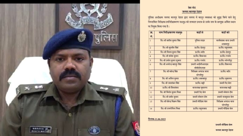 प्रभारी निरीक्षक बरौर विजय कुमार सिंह प्रभारी निरीक्षक डेरापुर बनाया है। प्रभारी निरीक्षक सिकंदरा संजेश कुमार को प्रभारी निरीक्षक गजनेर बनाया है। प्रभारी निरीक्षक गजनेर प्रमोद कुमार शुक्ला को प्रभारी निरीक्षक भोगनीपुर बनाया है।