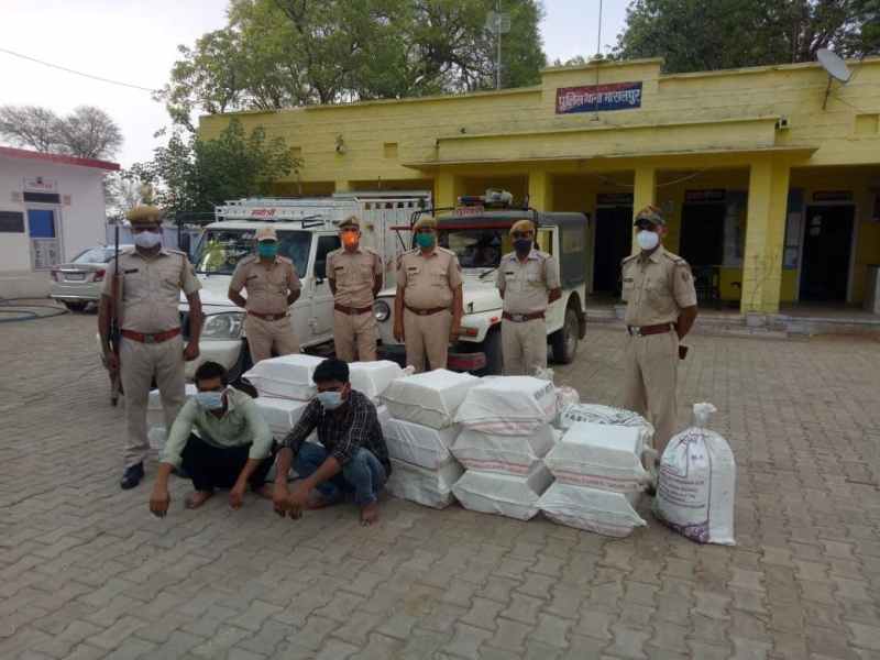 मासलपुर. पुलिस ने हिण्डौन से तस्करी कर धौलपुर ले जाई जा रही 69 पेटी अवैध शराब जब्त कर दो जनों को गिरफ्तार किया है। आरोपी धौलपुर सदर थानान्तर्गत सूबेदार का पुरा निवासी हरवेन्द्र सिंह राजपूत एवं कंचनपुर थानांतर्गत भीमगढ़ निवासी सुनील उर्फ लाला राजपूत है। थानाधिकारी शैलेन्द्र सिंह ने बताया कि पुलिस अधीक्षक के निर्देश पर चलाए जा रहे अभियान के तहत पुलिस ने शुक्रवार को एनएच 11बी पर कार्रवाई कर अवैध शराब पकड़ी। थानाधिकारी के अनुसार वह पुलिस दल के साथ हाइवे पर नाकाबंदी कर रहे थे। इस दौरान पुलिस को करौली की ओर से एक पिकअप आती दिखाई दी। उसने पिकअप को रोक तलाशी ली। जिसमें शराब मिली। (एक संवाददाता)