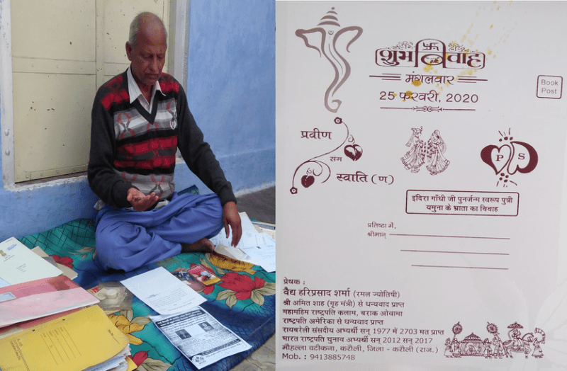 करौली में चटीकना मोहल्ला निवासी रमल ज्योतिषि वैद्य हरिप्रसाद शर्मा के पुत्र प्रवीण की 25 फरवरी को शादी है। शादी के कार्ड में उन्होंने अपनी एक पुत्री यमुना को पूर्व प्रधानमंत्री इन्दिरा गांधी की पुर्नजन्म स्वरूपा अंकित किया है। हालांकि वे इसके बारे में कोई ठोस प्रमाण तो नहीं देते। केवल ज्योतिष आधार पर यह दावा कर रहे हैं।