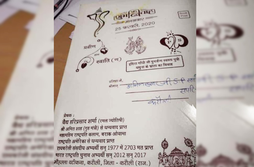 शादी कार्ड पर गृह मंत्री अमित शाह और देश के राष्ट्रपति रहे अब्दुल कलाम से साथ अमरीका के पूर्व राष्ट्रपति बराक ओबामा से मिले धन्यवाद का उल्लेख किया गया है। इसके अलावा रायबरेली सीट से वर्ष 1977 में चुनाव लड़कर 2703 मत मिलने का भी उल्लेख है। इसी कारण से यह अनूठा कार्ड सोशल मीडिया पर वायरल हो रहा है।