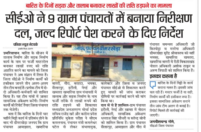 ढीमरखेड़ा की सात ग्राम पंचायतों में हुई गड़बड़ी के मामले को पत्रिका ने उजागर किया। शिकायत की जांच कराई गई। नौ पंचायतों की शिकायत हुई थी। सात में सही पाई गई। इसमें रिकवरी के आदेश सहित सभी दोषियों को शोकाज नोटिस जारी किया गया है।