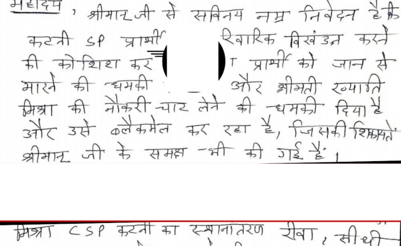 हाथ से लिखे गए शिकायती पत्र में कटनी एसपी अभिजीत रंजन पर गंभीर आरोप लगाए गए हैं। तहसीलदार शर्मा की ओर से दिए गए कथित शिकायती पत्र में उनकी रेकी करवाने और जान से खत्म किए जाने की धमकी का भी उल्लेख किया गया है।