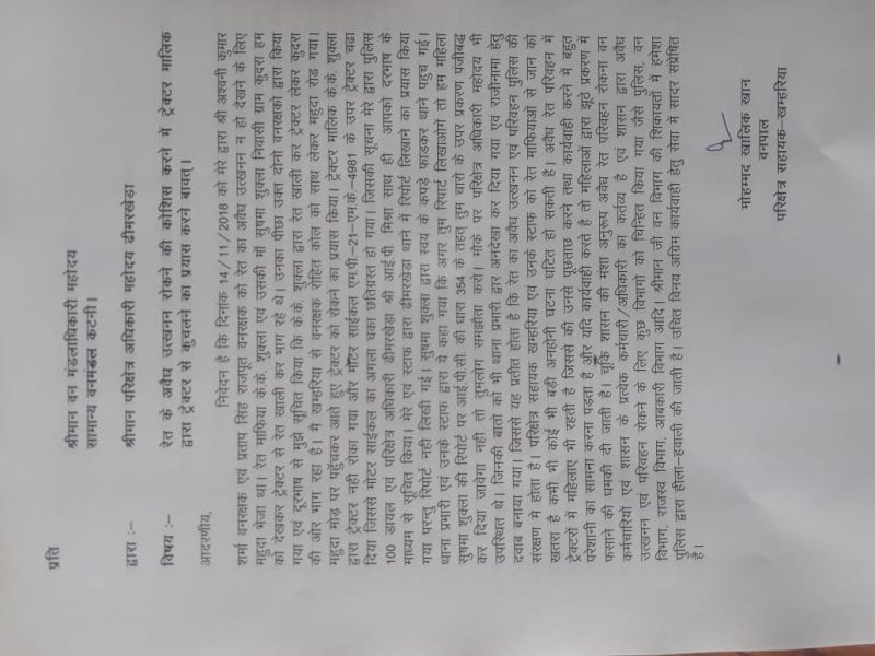 14 नवंबर को मेरे द्वारा वनरक्षक अश्वनी कुमार शर्मा व प्रताप सिंह राजपूत को रेत का अवैध उत्खनन न हो देखने के लिए महुदा भेजा था। रेत माफिया केके शुक्ला व उसकी मां सुषमा शुक्ला निवासी ग्राम कुदरा देखकर ट्रैक्टर खाली कर भाग रहे थे। दोनों वनरक्षकों ने पीछा किया। दूरभाष पर मुझे सूचना दी। मैं खम्हरिया से वनरक्षक रोहित कोल को साथ लेकर महुदा घाट रोड गया। भाग रहे ट्रैक्टर को रोकने का प्रयास किया। ट्रैक्टर मालिक द्वारा ट्रैक्टर नहीं रोका गया। मोटर साइकिल एमपी-21एमके 4981 के ऊपर चढ़ा दिया। मोटर साइकिल का अगला ***** छतिग्रस्त हो गया। जिसकी सूचना मेरे द्वारा 100 पुलिस व परिक्षेत्र ढीमरखेड़ा आईपी मिश्रा को दी गई। मेरे व स्टाफ द्वारा ढीमरखेड़ा थाने में रिपोर्ट लिखाने का प्रयास किया। रिपोर्ट नहीं लिखी गई। सुषमा शुक्ला द्वारा स्वयं के कपड़े फाड़कर थाने पहुंच गई। थाना प्रभारी व उनके स्टाफ द्वारा ये कहा गया कि अगर तुम रिपोर्ट लिखाओगे तो हम महिला सुषमा शुक्ला की रिपोर्ट पर आईपीसी की धारा 354 के तहत तुम चारों के खिलाफ प्रकरण दर्ज कर दिया जाएगा। नहीं तो तुम लोग समझौता कर लो। मौके पर परिक्षेत्र अधिकरी भी मौजूद थे। जिनकी बातो को भी महिला थाना प्रभारी द्वारा अनदेखा कर दिया गया। राजीनामा हेतु दबाव मनाया गया। जिससे यह प्रतीत होता है कि रेत का अवैध उत्खनन व परिवहन पुलिस की संरक्षण में होता है। परिक्षेत्र सहायक खम्हरिया व उनके स्टाफ को रेत माफियाओं से जान को खतरा है। कभी कोई बड़ी घटना हो सकती है। शासन की मंशानुरूप अवैध रेत परिवहन रोकना वन कर्मचारी व शासन के हर एक कर्मचारी का कर्तव्य है। शासन द्वारा अवैध उत्खनन एवं परिवहन रोकने के लिए कुछ विभागों को चिन्हित किया गया है। उसमें पुलिस, वन, राजस्व व आबकारी विभाग शामिल है। वन विभाग की शिकायत में हमेशा पुलिस द्वारा हीला हवाली की जाती है।