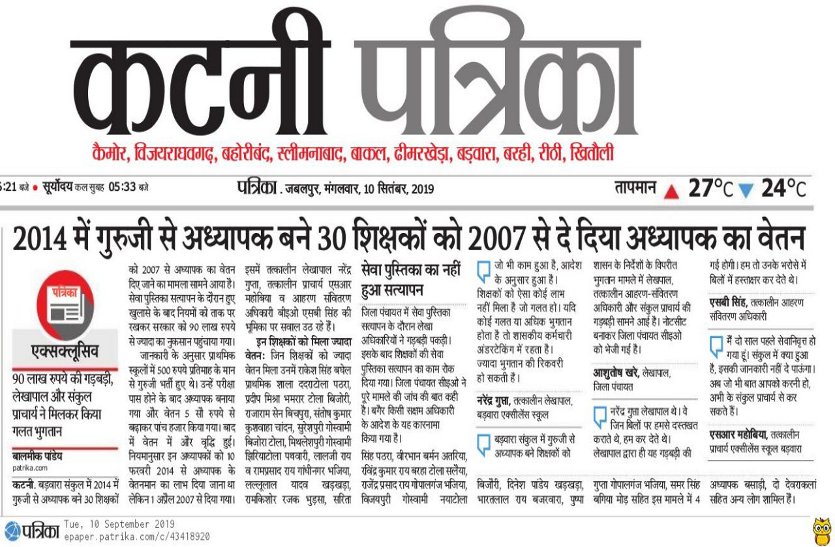 कटनी. बड़वारा संकुल में गुरुजी से अध्यापक बने 30 अध्यापकों को नियम विरुद्ध तरीके से वेतनमान के लाभ दिए जाने के मामले में जांच टीम गठित हुई है। (Education department) इस मामले में जिला पंचायत सीइओ जगदीशचंद गोमे ने टीम गठित की है। इसमें 90 लाख रुपये से अधिक की हुई आर्थिक गड़बड़ी की जांच होगी। (fraud in education department) पत्रिका द्वारा 10 सितंबर को '2014 में गुरुजी से अध्यापक बने 30 शिक्षकों को 2007 से दे दिया अध्यापक का वेतन' नामक शीर्षक से फर्जीवाड़े को उजागर किया। इस मामले में जिला पंचायत सीइओ ने बुधवार को जांच टीम गठित की है। इसमें डीपीसी, डीइओ, ट्रेजरी के पेंशन अधिकारी, एपीसी की टीम में शामिल किया गया है। यह टीम पूरे प्रकरण की जांचकर रिपोर्ट सौंपेंगी।