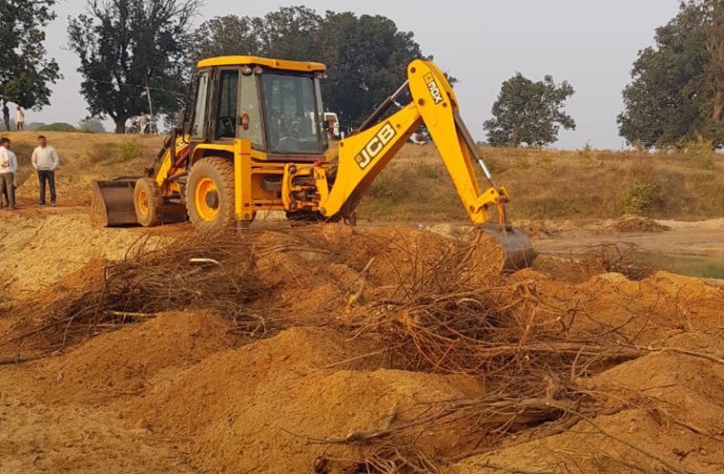 उमड़ार नदी की धार रोक बनी सड़क को तोड़वाते हुए जिला प्रशासन के अधिकारी-कर्मचारी.