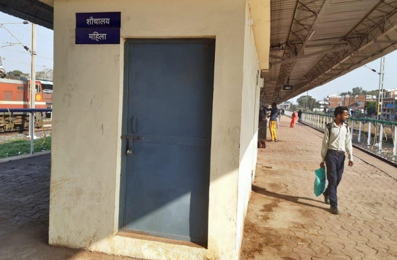 कटनी मुड़वारा रेलवे स्टेशन के प्लेटफार्म पांच पर स्थित शौचालय में ताला.