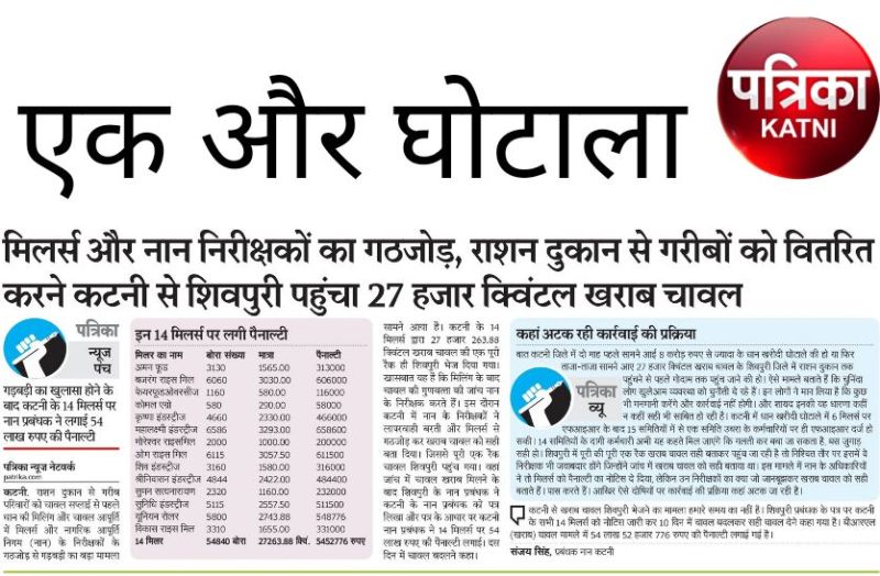 14 मिलर्स पर लगाई 54 लाख रुपए की पैनाल्टी - खराब चावल सप्लाई मामले में नागरिक आपूर्ति निगम कटनी द्वारा 14 मिलर्स पर 54 लाख रुपए की पैनाल्टी लगाई गई है। इसमें अमन फूड 3130 बोरा में 1565 क्विंटल पर 3 लाख 13 हजार रुपए, बजरंग राइस मिल पर 6060 बोरा में 3 हजार 30 क्विंटल पर 6 लाख 6 हजार रुपए, फेयर फूड ओवरसीज पर 1160 बोरा में 580 क्विंटल खराब चावल पर 1 लाख 16 हजार रुपए, कोमल एग्रो 580 बोरा 290 क्विंटल 58 हजार रुपए, कृष्णा इंडस्ट्रीज 4 हजार 660 बोरा 2 हजार 330 क्विंटल 4 लाख 66 हजार रुपए, महालक्ष्मी इंडस्ट्रीज 6586 बोरा 3 हजार 293 क्विंटल 6 लाख 58 हजार 6 सौ रुपए, मोरेश्वर राइस मिल 2 हजार बोरा, 1 हजार क्विंटल 2 लाख रुपए, ओम राइस मिल 6 हजार 115 बोरा 3 हजार 57 क्विंटल 6 लाख 11 हजार 5 सौ रुपए, शिव इंडस्ट्रीज 3 हजार 160 बोरा 1 हजार 580 क्विंटल 3 लाख 16 हजार रुपए, श्रीनिवासन इंडस्ट्रीज 4 हजार 844 बोरा 2 हजार 422 क्विंटल 4 लाख 84 हजार 4 सौ रुपए, सुमन सत्यनारायण 2 हजार 320 बोरा 1160 क्विंटल 2 लाख 32 हजार रुपए, सुनिधि इंडस्ट्रीज 5 हजार 115 बोरा 2 हजार 557 क्विंटल 5 लाख 11 हजार 5 सौ रुपए, यूनियन रोलर 5 हजार 8 सौ बोरा 2 हजार 743.88 क्विंटल 5 लाख 48 हजार 776 रुपए, विकास राइस मिल 3 हजार 310 बोरा 1 हजार 655 क्विंटल 3 लाख 31 हजार रुपए कुल 14 मिलर्स 54 हजार 840 बोरा, 27 हजार 263.88 क्विंटल में 54 लाख 52 हजार 776 रुपए की पैनाल्टी शामिल है।