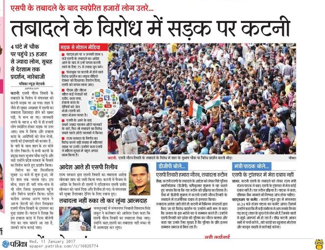 पहली बार ऐसा हुआ जब किसी अधिकारी के तबादले के विरोध में नागरिक स्वस्फूर्त सड़क पर आ गए। लगातार तीन दिनों तक विरोध में दुकानें बंद कर नारे लगाए गए। पूरे साल कटनी हवाला कांड की गूंज प्रदेश के सियासी हलकों में रही। कटनी हवाला की जांच पुलिस, इनकम टैक्स और ईडी के अधिकारी कर रहे हैं। हवाला कांड में बड़ी कार्रवाई करते हुए ईडी ने २० नवंबर को सरावगी बंधुओं की २.६५ करोड़ रुपये की संपत्ति अटैच की है।