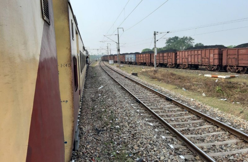 झलवारा एंड से आने वाली अंबिकापुर-जबलपुर एक्सप्रेस खड़ी है और सिंगरौली लाइन से मालगाड़ी का प्रवेश.