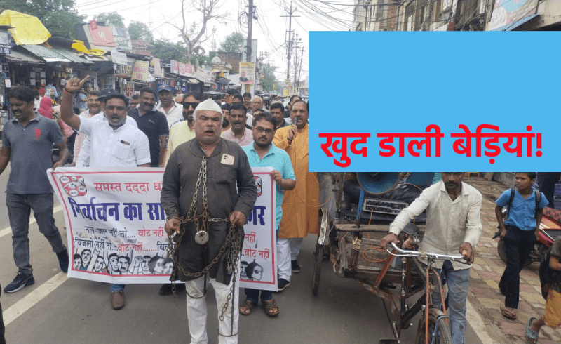 एमपी के कटनी में बुधवार को अजब नजारा दिखाई दिया। जिला मुख्यालय पर कलेक्ट्रेट से चंद किलोमीटर दूर स्थित दद्दाधाम कॉलोनी के रहवासी हाथ पैरों को बेड़ियों से जकड़कर चलते दिखाई दिए। पता चला कि दद्दाधाम कॉलोनी के ये लोग मूलभूत समस्याओं से परेशान होकर शहर में ये रैली निकाल रहे हैं। लोगों ने चुनाव का सामूहिक बहिष्कार की भी चेतावनी दी। रहवासी हाथों पर काली पट्टी बांधते हुए निर्वाचन का सामूहिक बहिष्कार के नारे लगा रहे हैं।