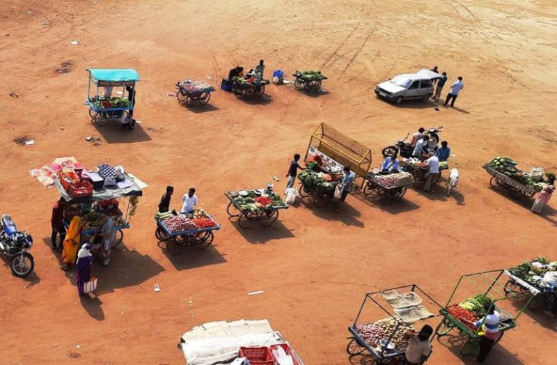 चिन्हित स्थानों पर सोशल डिस्टेंसिंग का पालन कर लग रही दुकानें।