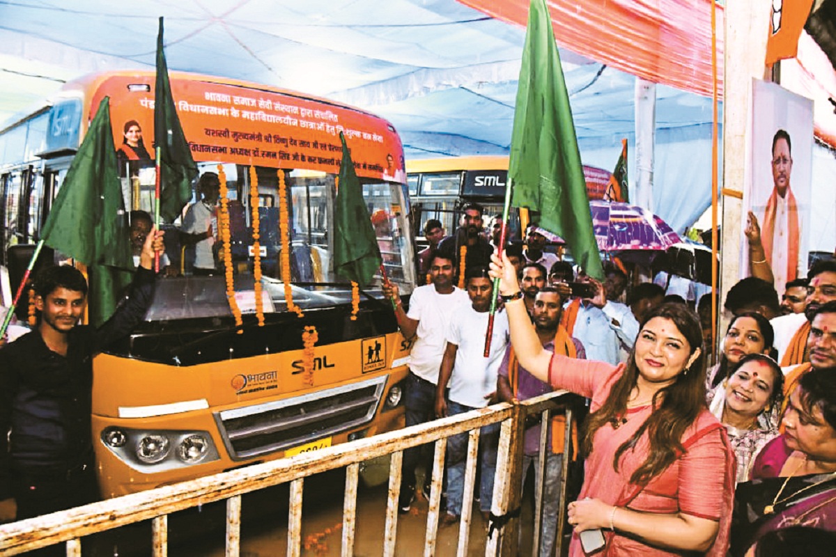 पंडरिया के पीएम श्री स्वामी आत्मानन्द शासकीय विद्यालय परिसर में मुख्यमंत्री विष्णुदेव साय, विधानसभा अध्यक्ष डॉ.रमन सिंह व उप मुख्यमंत्री विजय शर्मा ने पंडरिया विधानसभा के महाविद्यालयीन छात्राओं के लिए पंडरिया विधायक भावना बोहरा द्वारा संचालित 5 नि:शुल्क बसों का वर्चुअल लोकार्पण किया। इतने खराब मौसम के बावजूद आयोजन स्थल में 15 हजार से अधिक लोगों का आगमन हुआ और सभा स्थल पूरी तरह से भर गया। बारिश होने के बावजूद क्षेत्र की जनता और कार्यकर्ताओं में उत्साह दिखाई दिया और लगातार उनका आगमन व कार्यक्रम में उपस्थिति जारी रही। बारिश की वजह से मुख्यमंत्री हेलिकॉप्टर से उड़ान नहीं भर सके, लेकिन वर्चुअल ही उन्होंने सौगातों की झड़ी लगा दी।