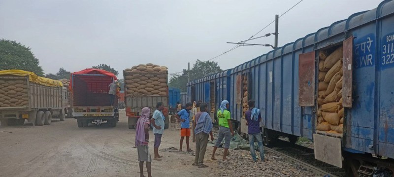 खंडवा में यूपी भेजने के लिए रैक पाइंट मक्का की लोडिंग करते श्रमिक