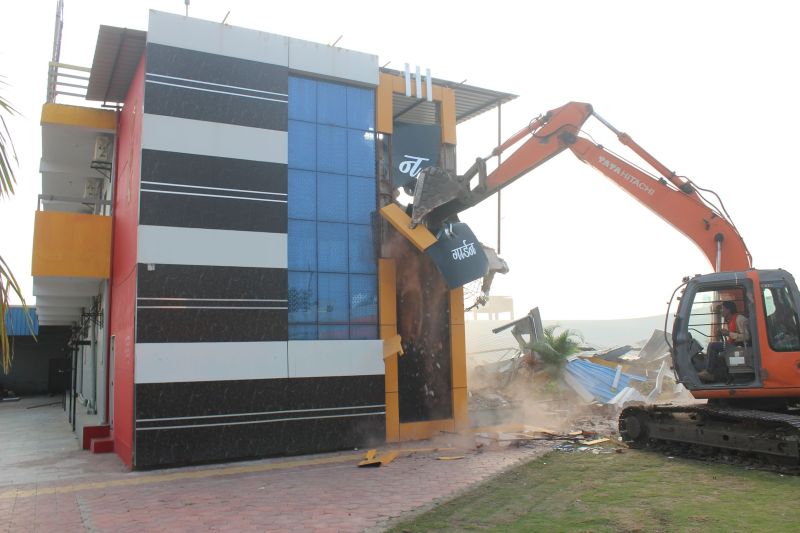 खंडवा. कॉलोनी में आमोद-प्रमोद (ग्रीन बेल्ट) की जगह पर संचालित हो रहे अवैध मैरिज गार्डन नक्षत्र पर बुधवार को प्रशासन का पंजा चला। बिना अनुज्ञा के चल रहे अवैध गार्डन पर कार्रवाई करते हुए प्रशासन, नगर निगम और पुलिस की संयुक्त कार्रवाई में नक्षत्र गार्डन का पूरा नक्शा बिगाड़ दिया। दो घंटे चली कार्रवाई के दौरान जेसीबी और पोकलेन मशीन से 48 हजार स्क्वेयर फीट पर पक्का अतिक्रमण तोड़ा गया। इस दौरान नक्षत्र गार्डन के संचालक नेताओं के भरोसे अवैध गार्डन को बचाने का प्रयास भी करते रहे, लेकिन प्रशासन ने किसी की नहीं सुनी और कार्रवाई जारी रखी।
