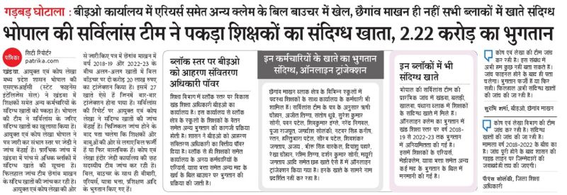पत्रिका में भोपाल की सर्विलांस टीम ने खंडवा में पकड़ा शिक्षकों के संदिग्ध खातों में भुगतान की प्रकाशित की गई खबर