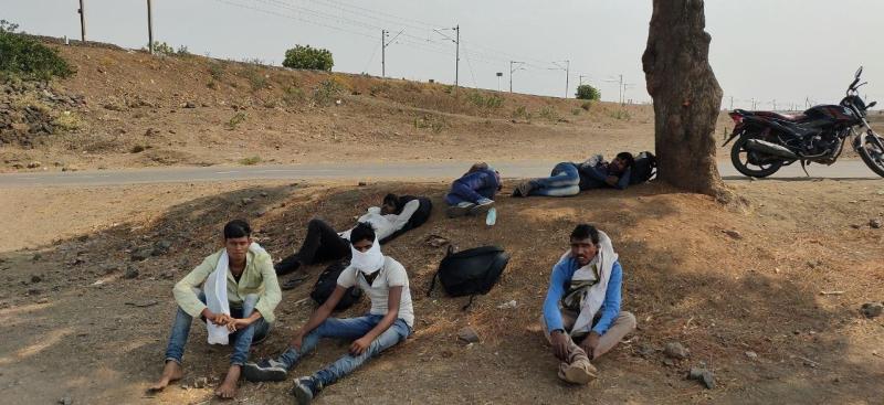 हरसूद। बुरहानपुर सूत मिल के मजदूर रेलवे ट्रैक के रास्ते बिहार जा रहे। थकने से कुछ देर पेड़ के नीचे आराम करने लगे।