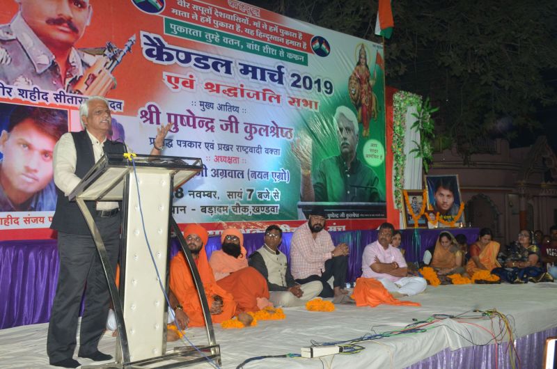 खंडवा. हमारे देश में बड़ी-बड़ी समस्याओं को छिपा लिया जाता है और छोटे-छोटे मुद्दों पर हंगामा होता है। हमेशा गुलामी की याद दिलाई जाती है। हमारी वीरता की कहानियां नहीं बताई जाती। कभी उन विषयों पर नहीं बोला जाता, जिनसे हमारा सनातन जागृत हो। इन सत्ताधारियों ने सत्ता पाने के लिए राष्ट्र का ही सौदा कर दिया है। यह बातें गुरुवार को युवा जनमत संग्रह और शहीदों की याद में बड़ाबम चौक पर आयोजित श्रद्धांजलि सभा में प्रखर वक्ता पुष्पेंद्र कुलश्रेष्ठ ने कहीं। उन्होंने कहा हमारे देश में ऐसी व्यवस्था है कि कलेक्टर या अन्य अधिकारी लोगों के दस्तावेजों का सत्यापन करते हैं। वह तय करते है कि हमारा पिता कौन है। कलेक्टर को कैसे पता कि उक्त व्यक्ति मेरा पिता है। यह अधिकार सिर्फ मां को है। ऐसी कई व्यवस्थाएं है जो गलत हैं। उनमें सुधार होना चाहिए। वहीं इस समय देशभर में गंगा-जमुना तहजीब और भाईचारे का फ्रॉड चल रहा है। हमने गंगा-जमुना तहजीब की बड़ी कीमत चुकाई है। लेकिन अब ये फ्रॉड नहीं चलेगा। क्योंकि यह 1947 नहीं वर्ष 2019 चल रहा है। ध्यान रखें। संबोधित में कुलश्रेष्ठ ने जेएनयू के घटनाक्रमों को भी आड़े हाथ लिया। कार्यक्रम में स्वामी जितेन्द्रानंद महाराज, स्वामी भावेशानंद महाराज, संरक्षक अशोक पालीवाल, कमलजीत बग्गा, कौशल मेहरा, अमित जैन, माधव झा, आदित्य अग्रवाल आदि उपस्थित थे।