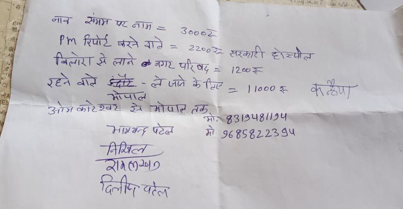 ओंकारेश्वर. मृतक के पिता द्वारा बेटे का शव ले जाने के लिए दिए रुपए का लिखा हिसाब।