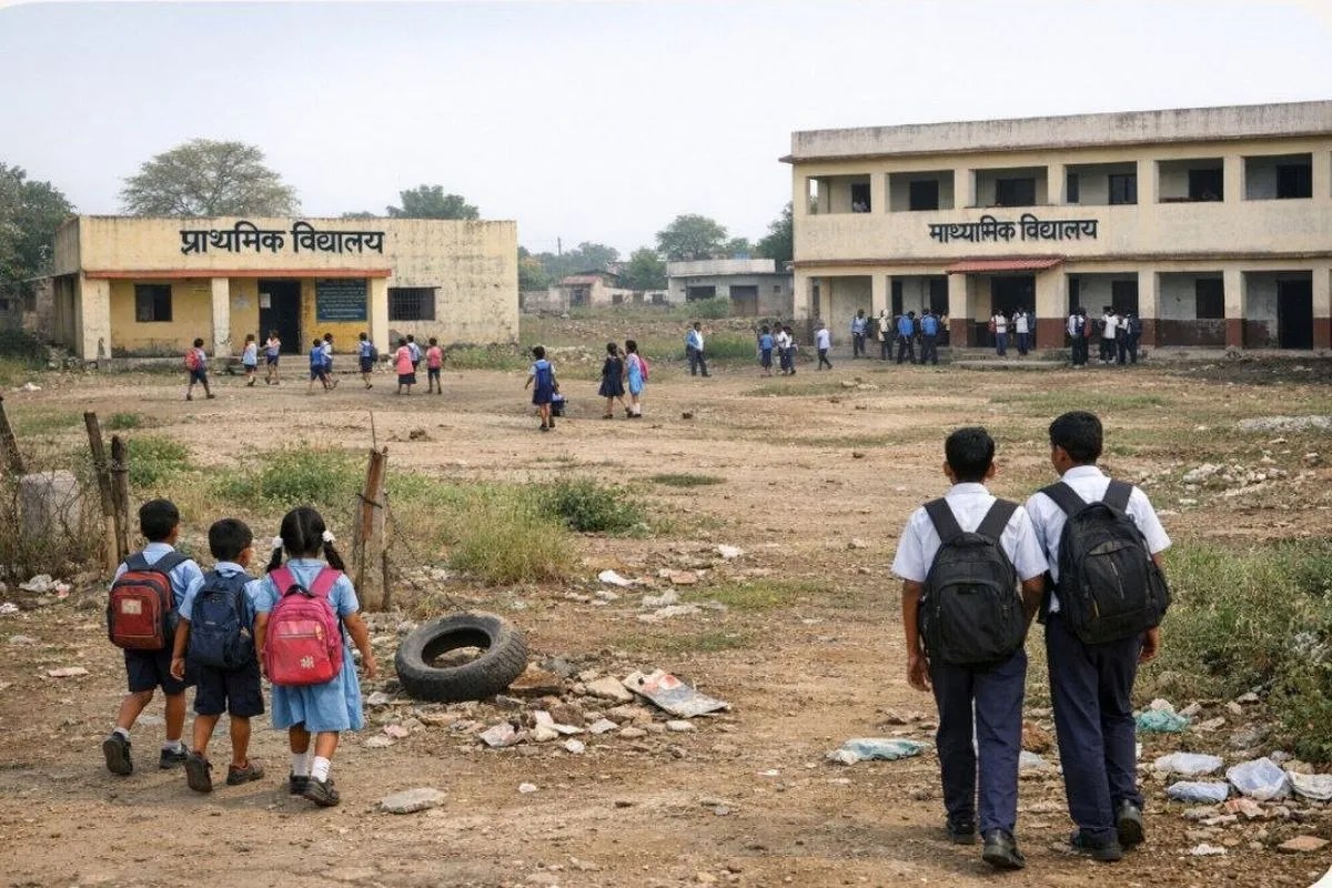 खंडवा : @ पत्रिका एआई फोटो...प्राथमिक व माध्यमिक स्कूलों में बाउंड्रीवाल नहीं होने से बच्चों की सुरक्षा खतरे में है।