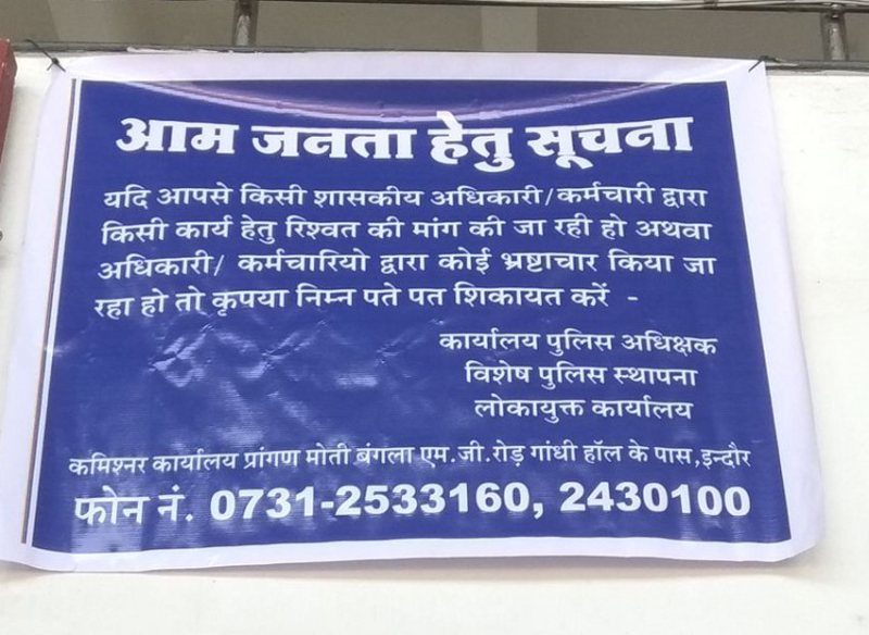 इसके लिए आप लोकायुक्त कार्यालय में शिकायत करें। खुद लोकायुक्त भी आमजनों से शिकायत करने की बात कह रहे हैं। इस तरह का बैनर सोमवार को कलेक्टर कार्यालय में लगा दिखाई दिया। लोकायुक्त कार्यालय के पते सहित फोन नंबर भी बैनर में होने से लोगों की निगाहें इस बैनर पर जा रही थीं। लोकायुक्त के जागरुकता पोस्टर में इंदौर कार्यालय अधीक्षक, विशेष स्थापना पुलिस के फोन नंबर दिए गए हैं। सरकारी अधिकारी, कर्मचारी रिश्वत मांगे या कार्यालय में भ्रष्टाचार होने की शिकायत करने के लिए बैनर में लिखे गए नंबरों पर सूचना दे सकते हैं।