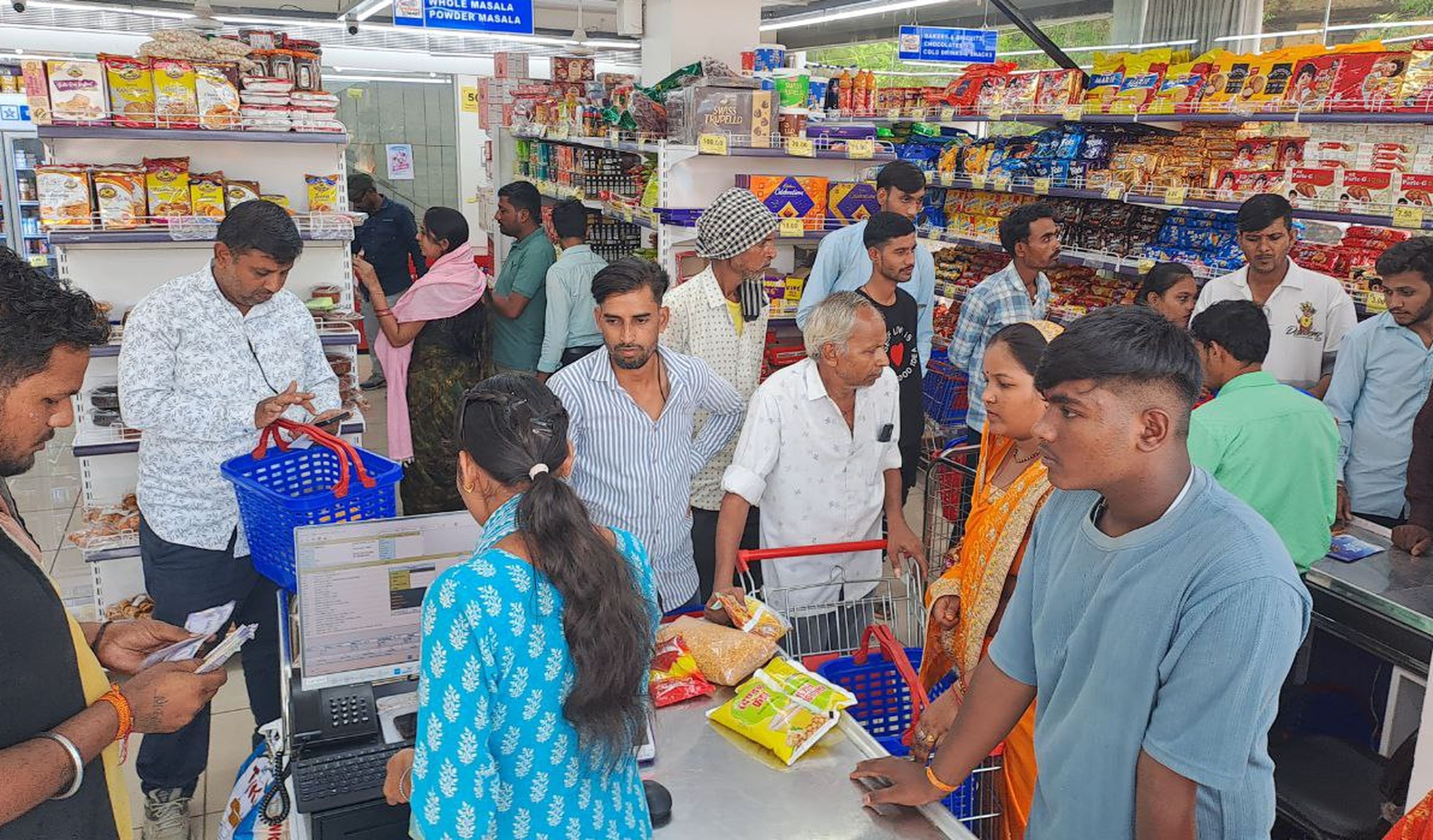 जी-मार्ट में ग्राहकों की लंबी कतार
