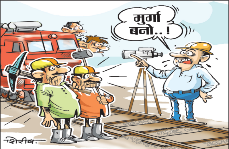 खंडवाः रेलवे ( railway ) ट्रैक पर कार्य में लापरवाही सामने आने पर रेल अफसर ( railway officer ) के पीडब्ल्यूआई एसएससी खंडवा को अनोखी सजा सुनाने का मामला सामने आया है। वरिष्ठ मंडल अभियंता (सीओ) ने पीडब्ल्यूआई से कहा कि, 'मुर्गा बन जाओ तो माफ कर दूंगा'। जब उन्होंने मुर्गा बनने से इनकार किया तो, अधिकारी ने उनके साथ तीन रेलकर्मियों को कार्य में लापरवाही बरतने पर निलंबित कर दिया। दरअसल, शनिवार सुबह डोंगरगांव के पास खंभा नंबर 544/4-6 के पास ब्लॉक लेकर ट्रैक मेंटेनेंस का कार्य किया जा रहा था। इस दौरान सुबह 11.30 बजे गाड़ी नंबर 12628 कर्नाटका एक्सप्रेस पहुंची। गाड़ी से भुसावल मंडल के वरिष्ठ मंडल अभियंता को राजेश चिकले वहां पहुंचे। वे दिल्ली से लौट रहे थे। उन्होंने ट्रैक पर कार्य का जायजा लिया। तभी उनकी नज़र छैनी-हथौड़े पर पड़ी। वो बोले- 'टैंपर मशीन से काम क्यों नहीं किया जा रहा? आप लोग ऐसे ही काम करते हो। लापरवाही बरतने वालों के खिलाफ निलंबन की कार्रवाई की जाएगी।' बात सुनकर पीडब्ल्यूआई ने टैंपर मशीन खराब होने का बोला। तभी उन्होंने मशीन चालू की तो हो गई। ये देखकर वे भड़क उठे और चले गए। तभी पीडब्ल्यूआई उनसे माफी मांगने के लिए गए और मशीन की कमियों के संबंध में बताया।