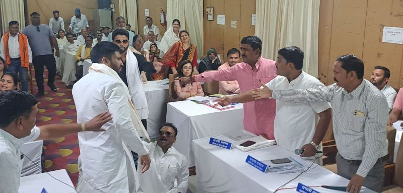 बैठक शुरू होने से पहले नेता प्रतिपक्ष का नाम सीट पर चिट नहीं होने पर हंगामा शुरू हो गया। नेता प्रतिपक्ष दीपक मुल्लू राठौर जमीन पर बैठ गए। कुछ देर से सांसद प्रतिनिधि के रूप में विधायक के पति मुकेश तनवे और विधायक प्रतिनिधि के रूप में भाजपा के पूर्व अध्यक्ष हरीश कोटवाले पहुंचे। दोनों प्रतिनिधियों का एमआईसी सदस्य सोमनाथ काले ने माइक पर एनाउंस कर स्वागत किया। प्रतिनिधियों के बैठने की व्यवस्था मंच की बजाए पार्षदों के साथ नीचे की गई थी। इसे लेकर पार्षद रामगोपाल शर्मा और प्रकाश यादव ने कहा सांसद, विधायक प्रतिनिधियों के बैठने की व्यवस्था परंपरागत नहीं की गई। दोनों पार्षद नेता प्रतिपक्ष के साथ जमीन पर बैठकर हंगामा करने लगे। सदन का माहौल देख दोनों प्रतिनिधि बाहर चले गए। बाहर मान मनौव्वल के बाद भी सांसद व विधायक प्रतिनिधि सदन में शामिल नहीं हुए।