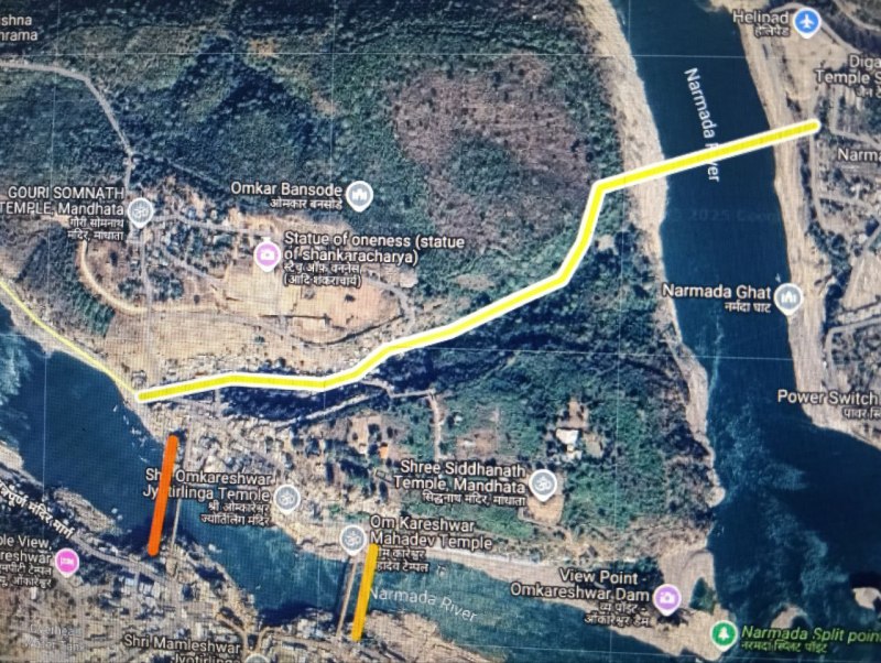 खंडवा. सिद्धवरकूट और ओंकारेश्वर को जोडऩे बनेगा पुल। पीली रेखा में पुल और रोड।