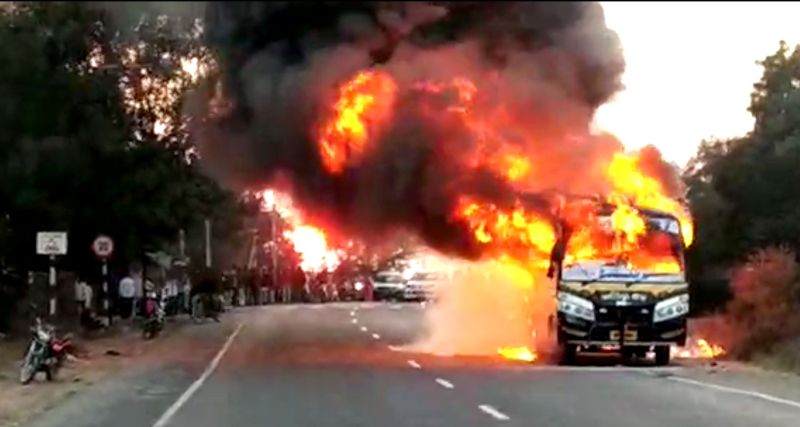 Two killed in road accident, angry mob set fire to bus in khandwa
