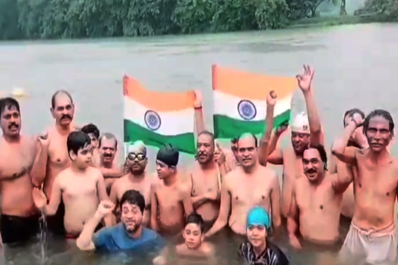 देश की आजादी का अमृत महोत्सव के तहत सरकार ने देशवासियों से 'हर घर तिरंगा अभियान' चलाने का आह्वान किया है। खंडवा में अभियान को अनोखा रंग देखने को मिला है। तैराक युवाओं के समूह ने अभियान के तहत नदी में तिरंगा लहराकर आजादी का जश्न मनाया। यही नहीं तैराकी करते हुए ये युवा भारत माता की जय के नारे लगाते हुए नदी के बीचो-बीच पहुंच गए। इस दौरान आबना नदी का दृश्य देखने वाले भी बड़ी संख्या में इकट्ठे हो गए। तैराक युवाओं ने बीच पानी में तिरंगे झंडे को फहराकर सलामी दी।