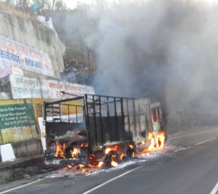 फोटो- घटना के बाद आग की लपटों से गिरा ट्रक।