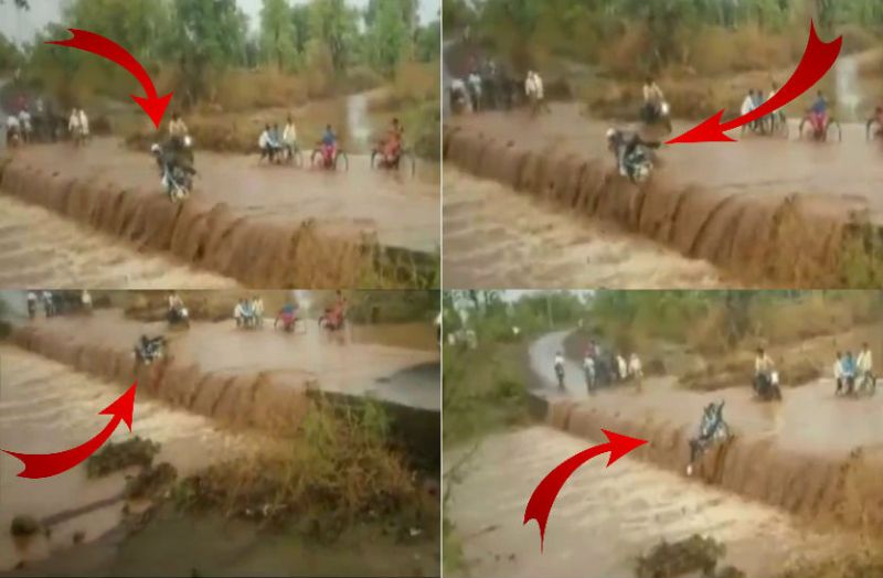 दरअसल, सड़क पर पानी का तेज बहाव हो रहा था। इसी बीच एक बाइक सवार सड़क पर बहते पानी को पार कर रहा था। तभी पानी का बहाव इतना तेज था कि वह बाइक समेत बह गया। लेकिन आगे जाकर वह गिर गया। वीडियो में दिख रहा है कि गिरने के बाद वह बाइक समेत खुद से निकलने की कोशिश कर रहा है। लेकिन बाहर नहीं आ पा रहा है।