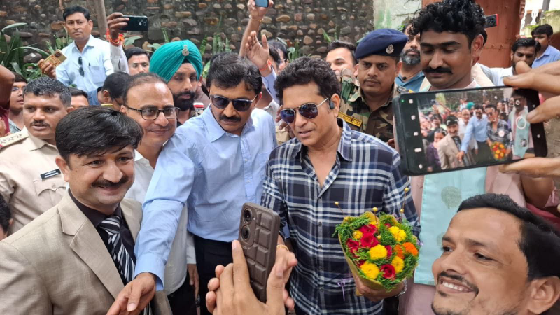 Sachin Tendulkar surrounded by crowd of fans in Maheshwar