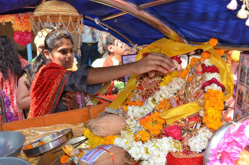मेले में निकली भगवान नवग्रह की पालकी का पूजन करती युवती