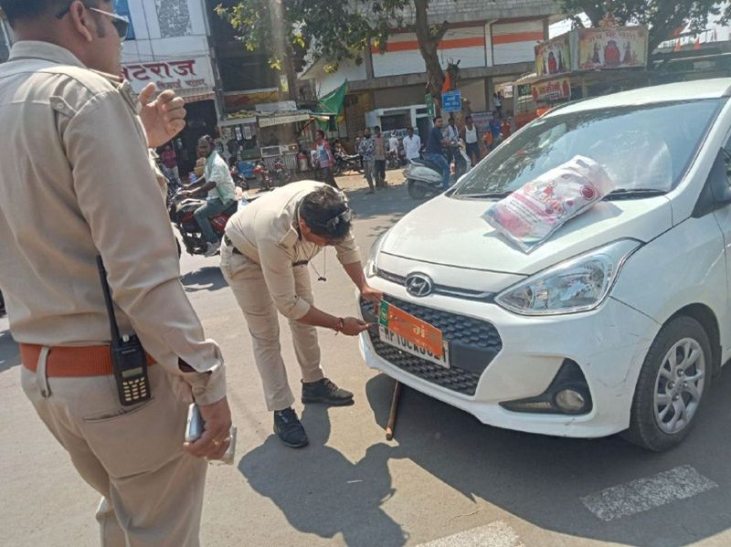 टीआई बनवारी मंडलोई ने बताया यह कार्रवाई सुबह 10.30 बजे से दोपहर तक चली। आचार संहिता का उल्लंघन करने वालों के खिलाफ चालानी कार्रवाई भी की गई। इस दौरान राजनीतिक पार्टियों से जुड़े कार्यकर्ता भी पुलिस के हत्थे चढ़े। कार्रवाई के दौरान पुलिस ने भाजपा की नगर महिला मोर्चा महामंत्री की गाड़ी को भी रोका। वाहन पर नंबर प्लेट के ऊपर पदनाम वाली पट़्टी लगी थी। जवानों ने इसे तत्काल हटाया और चालानी कार्रवाई की। इस दौरान कुछ वाहन ऐसे भी रोके गए जिनमें खिड़कियों के शीशों पर ब्लैक फ्रेम थी, उन्हें भी हटाया।