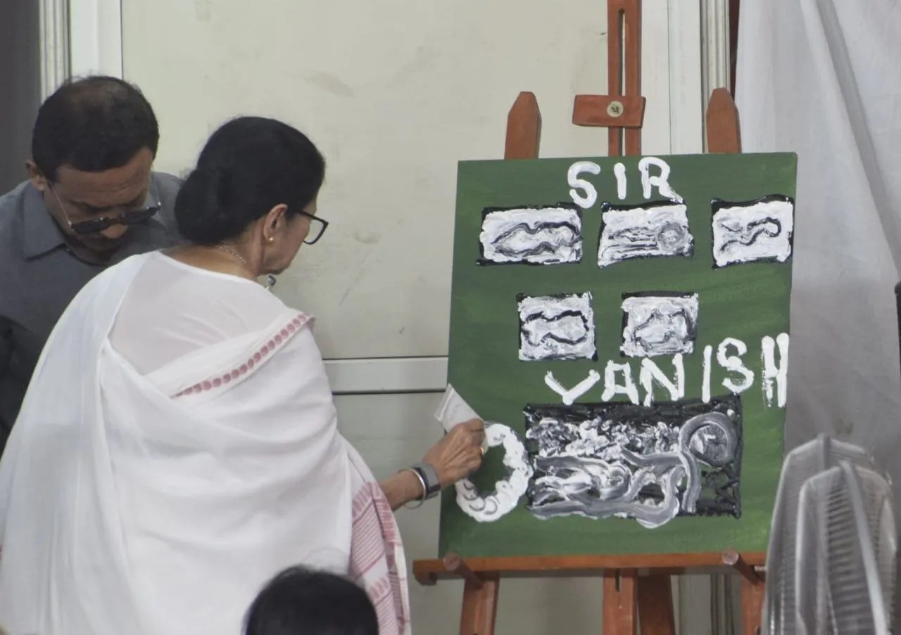 इससे पहले उन्होंने एसआइआर के खिलाफ एक प्रतीकात्मक विरोध दर्ज कराया। इस दिन मुख्यमंत्री ने धरना मंच पर ब्रश और कैनवास से एक पेंटिंग बनाई, जिसमें चुनाव आयोग के प्रति तीखा संदेश दिया। उन्होंने बड़े अक्षरों में 'एसआइआर' लिखा और मुख्य चुनाव आयुक्त ज्ञानेश कुमार पर टिप्पणी करते हुए उन्हें 'वैनिश कुमार' बताया। इसे चल रही मतदाता सूची पुनरीक्षण प्रक्रिया के खिलाफ विरोध के रूप में देखा गया। ममता बनर्जी ने दोहराया कि मतदाताओं के अधिकारों की सुरक्षा सुनिश्चित होने तक यह विरोध आंदोलन जारी रहेगा। पार्टी का आरोप है कि एसआइआर अभ्यास के तहत कई वैध मतदाताओं के नाम मतदाता सूची से हटाए जा रहे हैं। तृणमूल कांग्रेस नेताओं ने इस पेंटिंग को लोकतंत्र में मतदाताओं की सर्वोच्चता का प्रतीकात्मक प्रतिनिधित्व बताया। वहीं चुनाव आयोग का कहना है कि मतदाता सूचियों में पारदर्शिता सुनिश्चित करने के लिए पुनरीक्षण प्रक्रिया आवश्यक है।