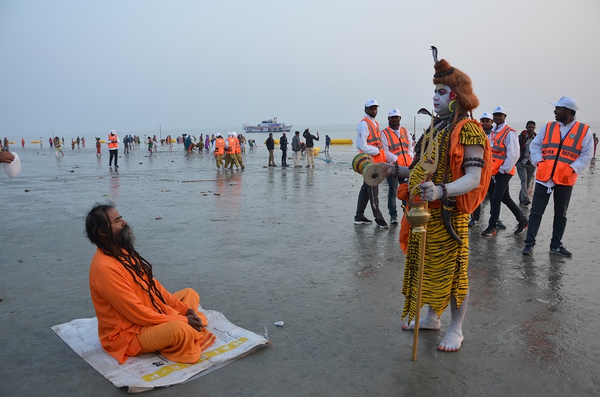 समुद्र तट पर विभिन्न एजेंसियों के कर्मचारी व जवान सांगर में डुबकी लगाने वालों की सुरक्षा में तैनात हैं।