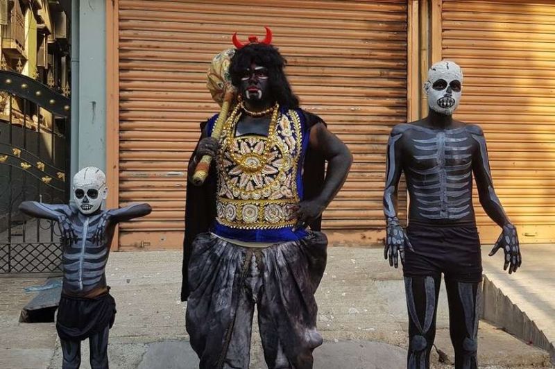 कोलकाता. लॉकडाउन के नियमों को तोडऩे वालों को अनोखे तरीके से सजग किया जा रहा है। सिंथी मोड़ से बरानगर के रास्ते गली में यमराज, कंकाल का वेश धरे कलाकार लोगों की भीड़ देखकर विकराल आवाज के साथ दौड़ा रहे हैं।