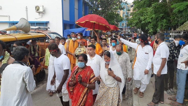 BENGAL NEWS कोलकाता. पश्चिम बंगाल में हुगली जिले में बुधवार को उल्टे रथ के दिन महेश स्तिथ जगन्नाथ मंदिर में सुबह से पूजा पाठ का विधिवत रूप से आयोजन हुआ। इसके बाद शाम को भगवान को मौसी घर से वापस अपने घर पहुंचाया गया।भगवान की शिला मूर्तियों को पालकी पर विराजमान करके 1 किलोमीटर पदयात्रा करते हुए मंदिर तक पहुंचाया गया। ज्ञात हो कि पुरी के रथ को विश्व में प्रथम स्थान प्राप्त है जबकि 624 वर्ष प्राचीन महेश रथयात्रा को दूसरा दर्जा। 624 वर्ष के रथयात्रा के इतिहास में ऐसा पहली बार हुआ है जब वैश्विक महामारी कोरोना के बढ़ते संक्रमण के वजह से प्राचीन रथ की डोर नहीं खिंची गई। भगवान को पालकी में बैठाकर झांकी निकालकर पैदल 9 दिन पहले उनके मौसी के घर पहुंचाया गया और बुधवार को उल्टे रथ के दिन पैदल पालकी में बैठाकर झांकी निकालकर उन्हें अपने स्थान पर वापस लाया गया। हालांकि परंपरा को बरकरार रखने के लिए रश्म को निभाया गया। पारंपरिक रूप से पूजा-पाठ का आयोजन भी हुआ। सरकारी निषेधाज्ञा का पालन करते हुए भक्तों को भगवान के दर्शन के लिए अनुमति दी गई। इस रथयात्रा और रथ मेले का आयोजन नहीं होने से काफी लोग मायूस हैं। मेले का आयोजन होने से अस्थाई दुकानदारों के रोजी-रोटी का जुगाड़ भी होता था उनके चेहरे पर उदासी छाई है। इधर रथ की डोर खिंचने से वंचित रह भक्त भी उदास है।