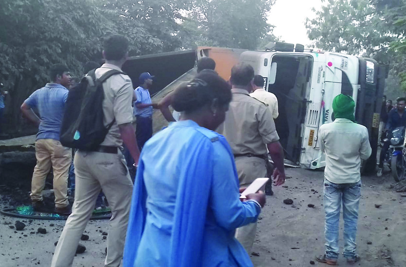 पुलिस ने बताया कि ट्रेलर सीजी 12 एएम 8221 कोरबा से कोयला लेकर चांपा जा रही थी। ग्राम पताढ़ी के पास चालक का गाड़ी से नियंत्रण हट गया। गाड़ी बीच सड़क पर पलट गई। चालक की जान बाल बाल बची। कोयला सड़क पर बिखर गया। इससे सड़क जाम हो गया। थानेदार दुर्गेेश राठौर स्टॉफ के साथ घटना स्थल पर पहुंचे। ग्रामीणों की मदद से कोयले को सड़क से उठाया गया। इसमें करीब दो घंटे का वक्त लगा। तब तक जाम लगा रहा।