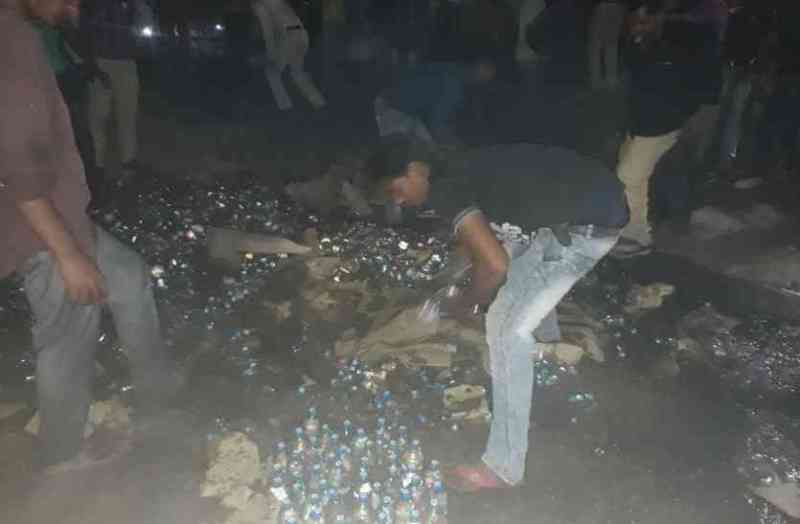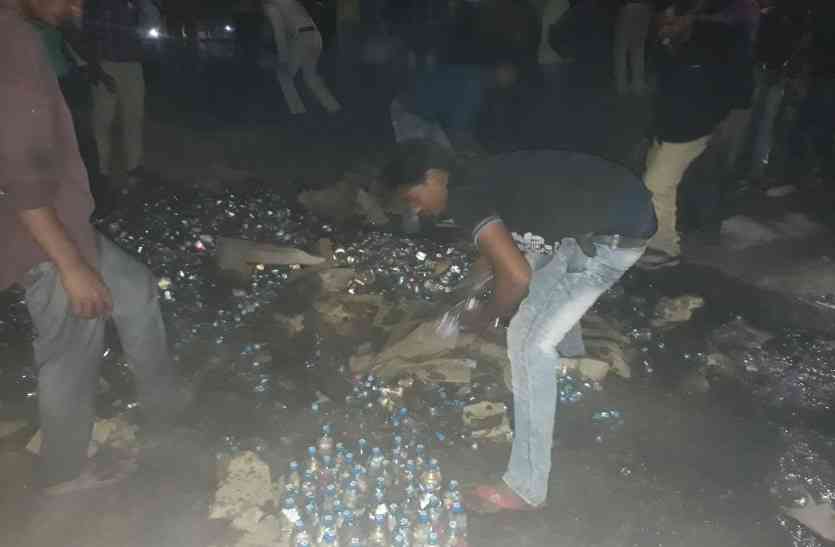 क्रासिंग पर पिकअप के सामने चल रहे बाइक चालक ने ब्रेक लगा दी। पिकअप चालक ने भी ब्रेक लगा दिया। पिकअप चढ़ाई नहीं चढ़ सकी। पीछे की ओर लुढ़कने लगी। इस बीच गाड़ी से आठ 10 पेटी शराब सड़क पर गिर गयी। शराब की बोतलें इधर-उधर सड़क पर फैल गई। लोगों की बोतलों पर की नजर पड़ी तो वे अपनी गाडिय़ां सड़क पर खड़़ी कर बोतलें उठाने लगे। इससे पॉवर हाउस मार्ग जाम होने लगा। लोग जाम में फंस गए।