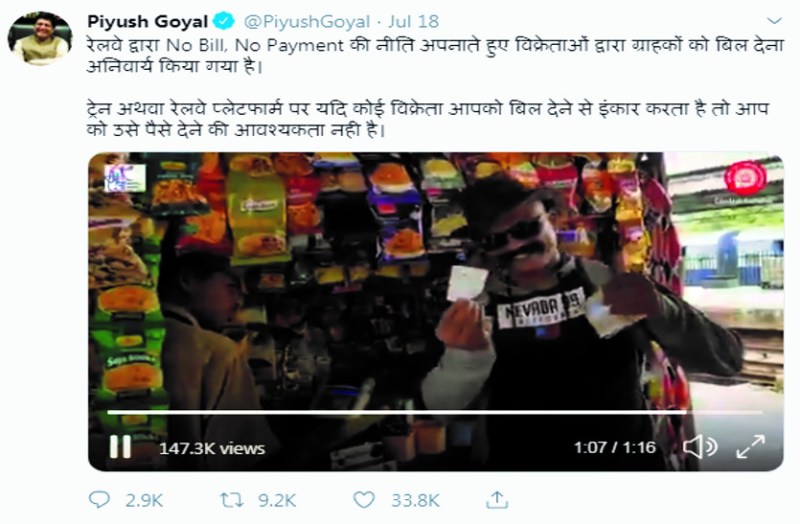 रेल मंत्री (Railway Minister) पीयूष गोयल ने यात्रियों की सुविधाओं व स्वास्थ्य को ध्यान में रखते हुए चाय-नास्ते के दुकान से बिल लेने के लिए पे्ररित किया। इसके बकायदा वीडियो भी जारी किया है। इसमें बिल नहीं देने पर यात्रियों सामान फ्री में देने का संदेश दिया है। इस ट्वीट के बाद यात्रियों व लोगों ने प्रतिक्रियाएं भी है।
