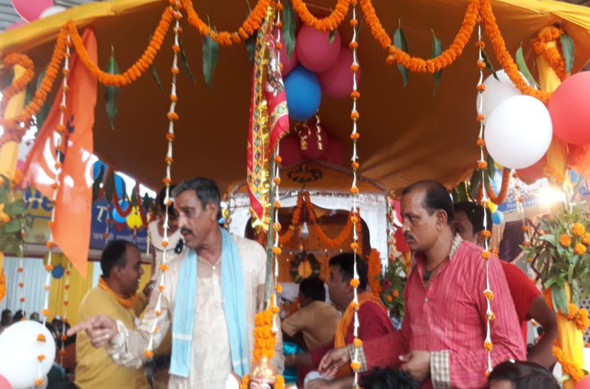 इसके बाद भगवान जगन्नाथ, सुभद्रा, बलभद्र तथा बजरंगबली की मूर्ति को जयकारे के साथ मंदिर से बाहर रथ की सात बार परिक्रमा की गई। जय जगन्नाथ की जयकारों के साथ परिक्रमा के दौरान आगे करमा नर्तक दल तथा इसके पीछे भक्तगण मूर्तियों को हाथों में लेकर रथ की परिक्रमा कर विराजमान किया गया।