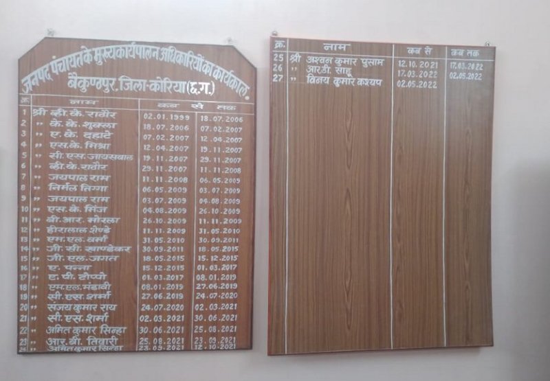 ऐसे में कई ग्राम पंचायतों में मिली वित्तीय अनियमितता की शिकायतों की जांच लंबित पड़ी है। गौरतलब है कि जिला गठन के 24 साल में जनपद पंचायत बैकुंठपुर में कुल 27 सीइओ बदले कार्य कर चुके हैं। लेकिन 21 साल में 17 सीइओ बदले गए हैं। जिसमें महज साढ़े तीन साल में 10 सीइओ बदल चुके हैं।
